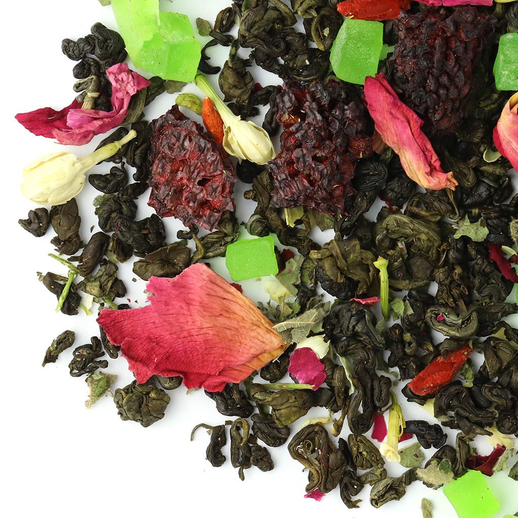 Чай зеленый ганпаудер, ягоды ежевики, кусочки ананаса, ягоды годжи, лепестки розы, листья ежевики, цветы жасмина, аромат тропических фруктов.